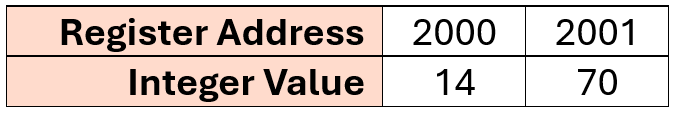 0x428C, can be stored in register2000, and the bytes0x47AEcan be stored in register2001. The connector reads the bytes in both registers, combines them into four bytes, and treats them as an IEEE floating point number representing70.14.
